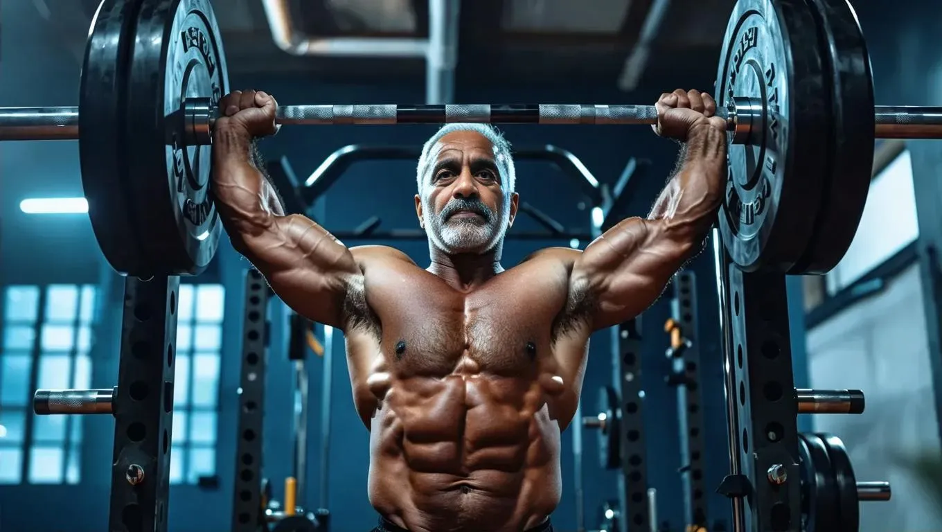 Generate AI-powered images of a fit 50-year-old man lifting weights at chest level. Vivago.ai creates realistic, well-lit fitness scenes with perfect muscle definition and dynamic lighting for professional workout visuals. Try AI image generation for midlife fitness inspiration.