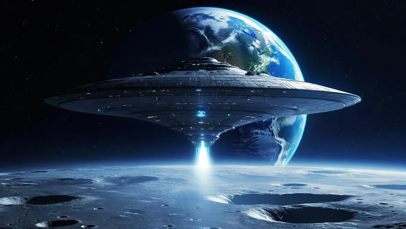 Generate AI concept art of a colossal alien spacecraft eclipsing Earth's shadow near the moon. Craft surreal sci-fi visuals with dystopian space scenes, cinematic extraterrestrial designs, and futuristic cosmic backdrops using Vivago.ai's advanced AI tools for professional-grade, otherworldly imagery.