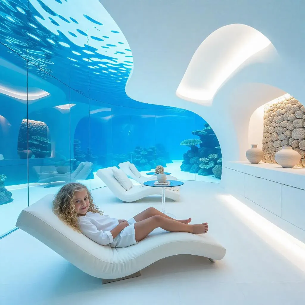 Generate a futuristic underwater oasis with AI image tools. This minimalist scene blends white/cream tones, curved glass panels showcasing marine life, and sleek metal frames. A blonde curly-haired girl lounges on transparent furniture amidst stone accents. Ideal for AI-generated architectural visualization, combining serene interiors with cutting-edge design through Vivago.ai's professional creative suite.