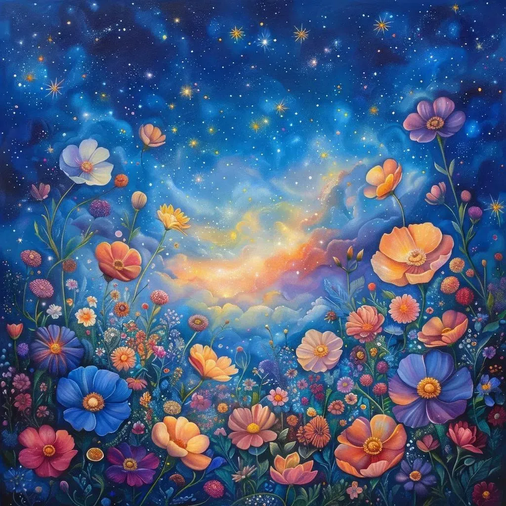 Generate a mesmerizing AI background blending vibrant floral explosions with cosmic wonder—dark blue starry skies, surreal colors, and mystical depth. Perfect for surreal art, digital projects, or ethereal visuals. Elevate creativity with Vivago.ai's AI tools for dreamlike, professional-grade imagery.