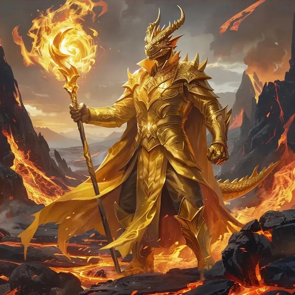 Generate a gold dragonborn male warlock of the fire genie with AI. Craft mystical D&D character art featuring radiant scales, fiery aura, and arcane symbols. Perfect for RPG campaigns or fantasy visuals. Use VivaGo.ai's AI tools to transform text into professional-grade, genie-patroned warlock designs effortlessly.