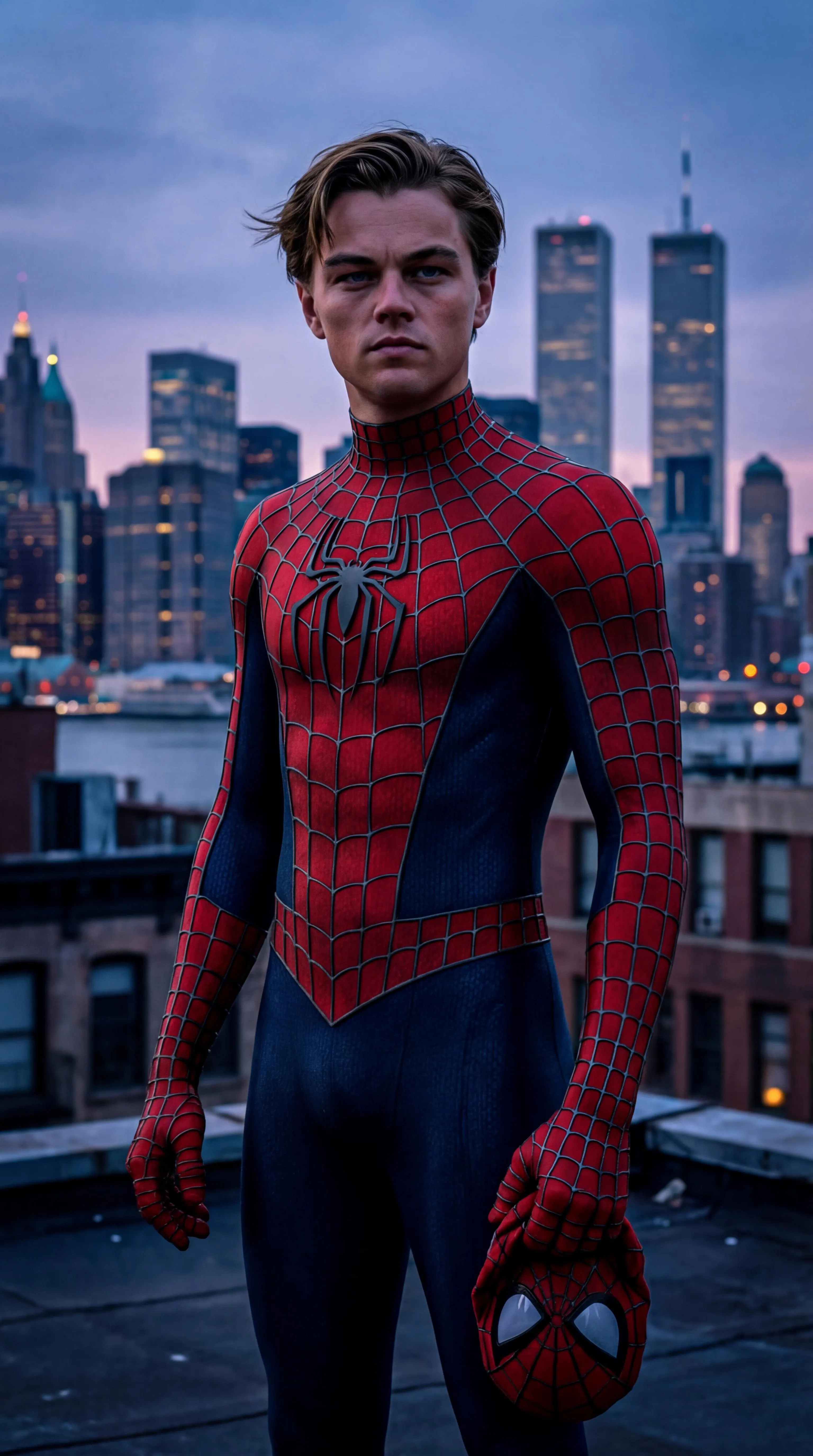Create Leonardo DiCaprio as James Cameron's Spider-Man with AI. Merge multiple fan images into one seamless, hyper-realistic portrayal using vivago.ai's advanced image generation. Transform text prompts into iconic superhero visuals effortlessly. Perfect for unique fan art and concept exploration.