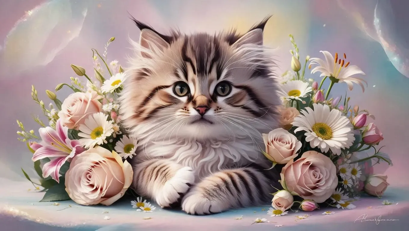 Create a whimsical AI-generated image of a playful cat holding vibrant flowers. Perfect for social media, digital art, or personalized projects. vivago.ai transforms text prompts into stunning visuals with lifelike details and vibrant effects. Try our AI tool for professional-grade results effortlessly.