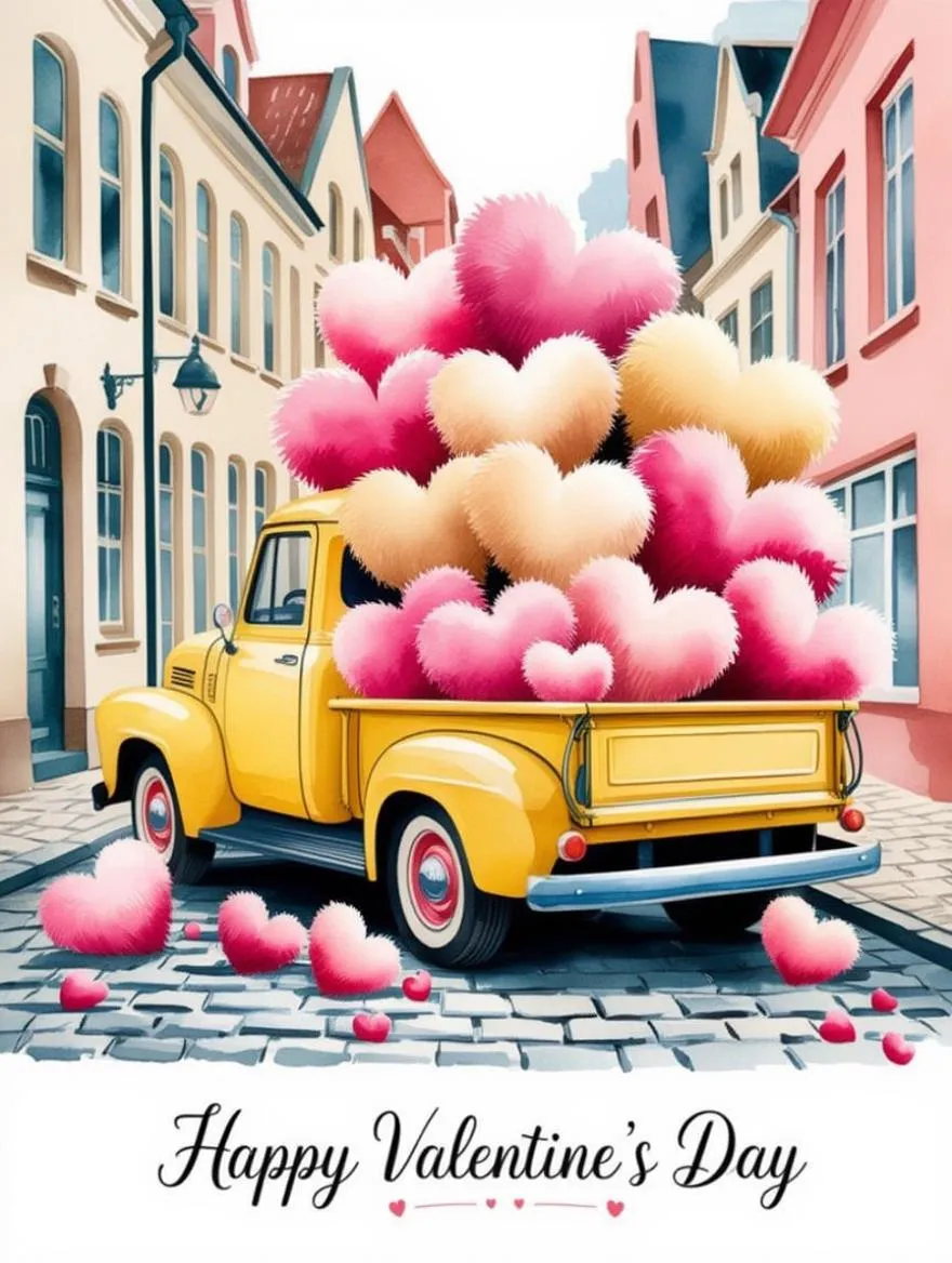 Create a charming retro Scandinavian-style watercolor illustration of a vintage yellow truck on a cobblestone street, overflowing with fluffy hearts for Valentine's Day. Featuring soft minimalist hues, hot pink, beige, and blue tones. Perfect for AI-generated Valentine's art, Scandinavian-inspired designs, and festive watercolor themes. Transform prompts into nostalgic, heartwarming visuals with Vivago.ai's creative tools.