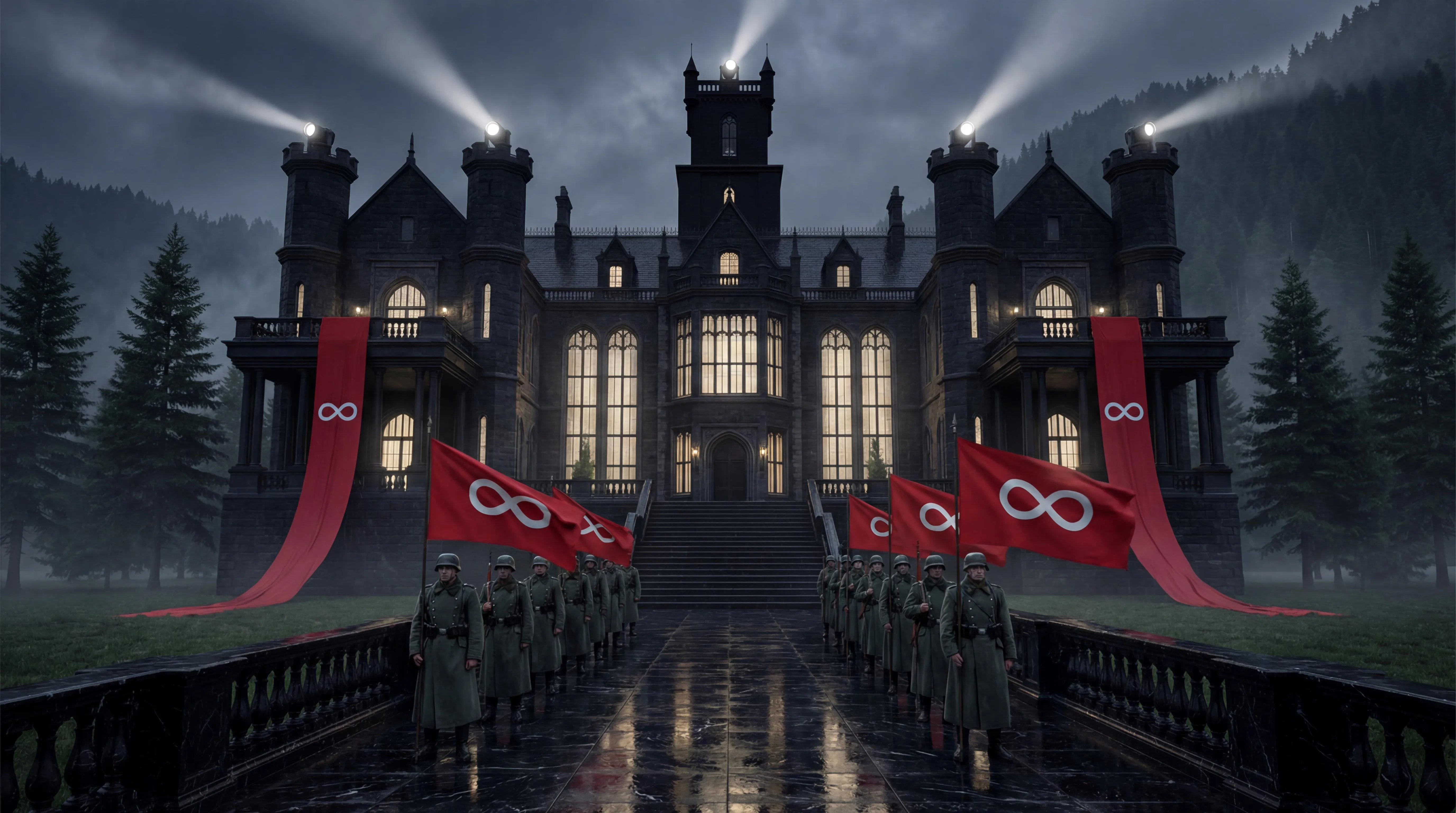 Create stunning AI-generated night scenes of a Gothic infinity mansion with dramatic red canvases, towering black spires, and searchlights. Generate images featuring a company of 1940s German soldiers on wet marble walkways amidst fluttering infinity flags. Design your own haunting, atmospheric visuals with Vivago.ai's powerful image generation tools.