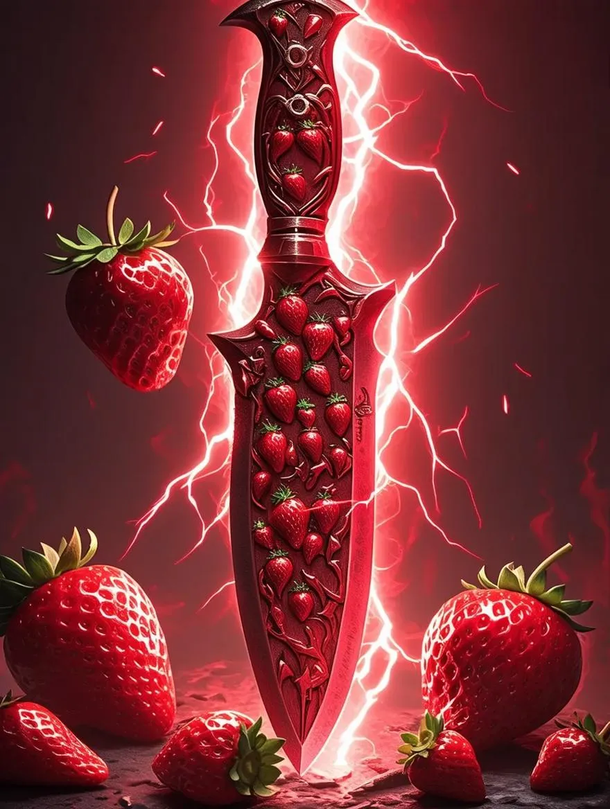 Craft AI-generated knives with intricate strawberry motifs and electrifying aura lightning. Forge your vision in dark, dimmed redlight ambiance using vivago.ai's AI effects. Elevate creative projects with striking strawberry-ornamented blades and professional-grade editing tools for mesmerizing visual content.