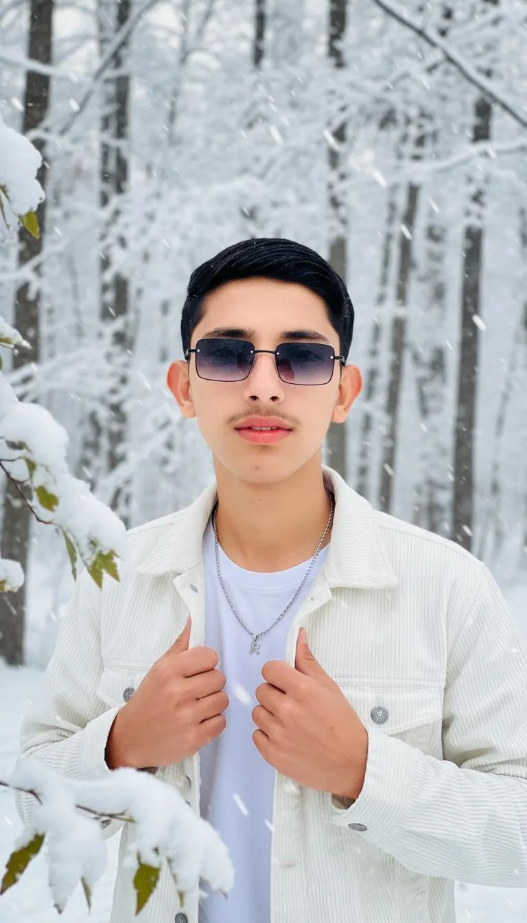 Generate ultra-detailed, realistic AI images with vivago.ai. Transform prompts into visuals featuring a young man in a white corduroy jacket, silver 'R' chain, gradient sunglasses, and SAME hair against a snowy forest backdrop with falling snow. Experience professional-grade, aesthetic AI image creation.