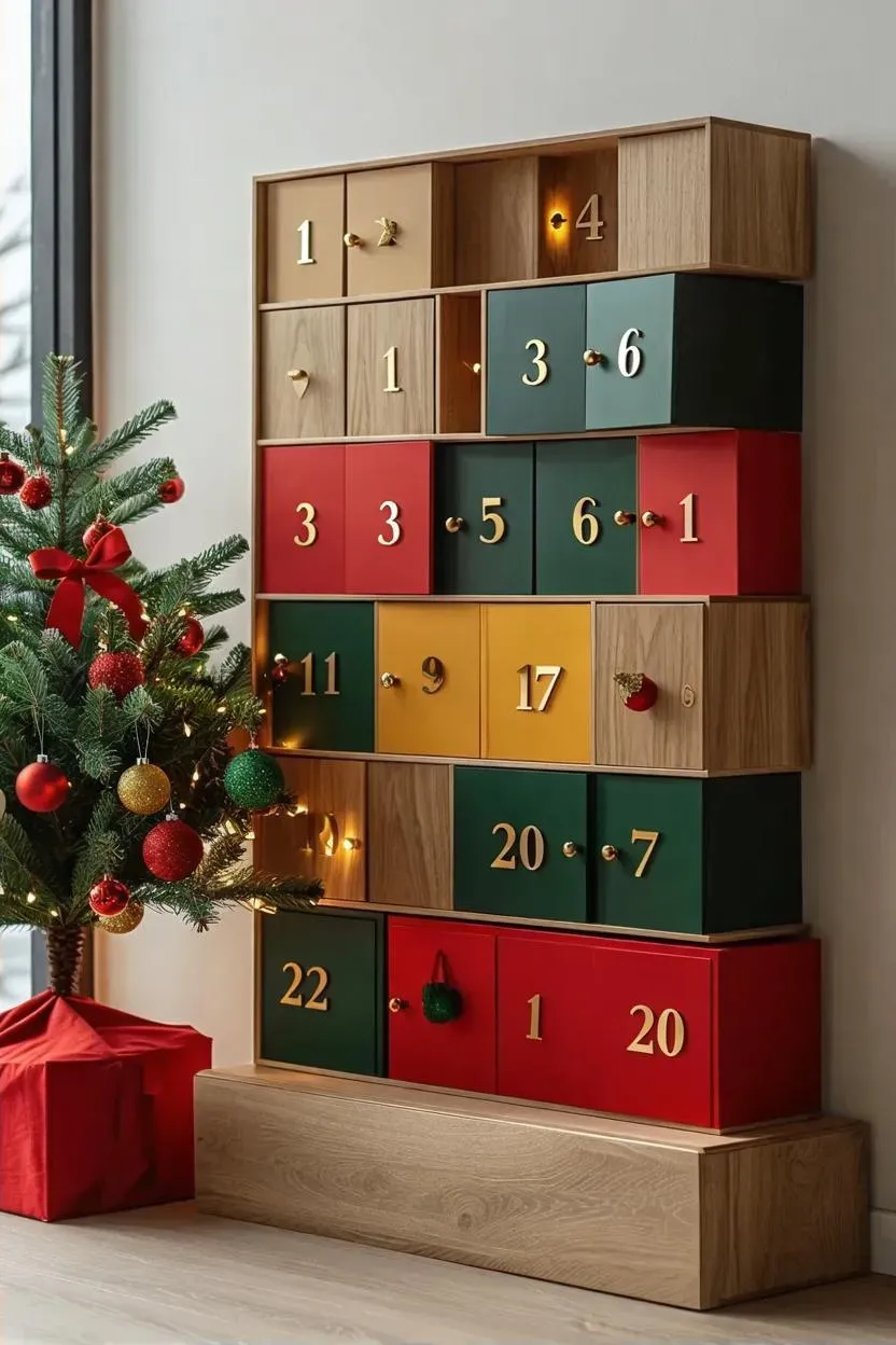 Discover a modern advent calendar blending traditional holiday colors with 24 numbered doors for daily festive reveals. Perfect for countdowns, decor, or gifts. Create AI-generated designs combining classic charm and contemporary style. Ideal for Christmas enthusiasts seeking creative digital crafting tools.