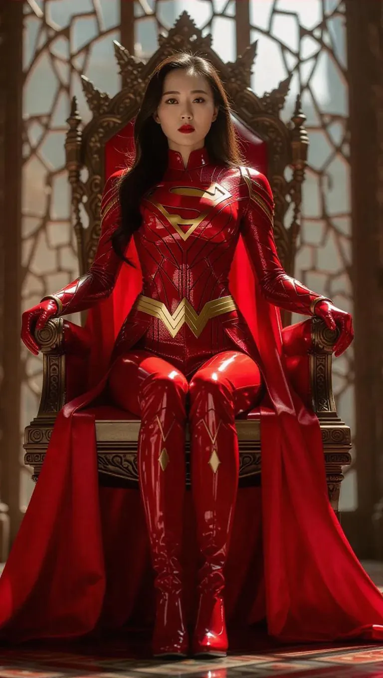 Create stunning AI-generated visuals of a Chinese superheroine with Vivago.ai. Design a powerful pose featuring a red Kevlex suit, CHINA emblem, crimson cape, and thigh-high boots. Perfect dynamic seating postures, full-body angles, and costume details using advanced AI image generation tools for professional superhero character visualization.