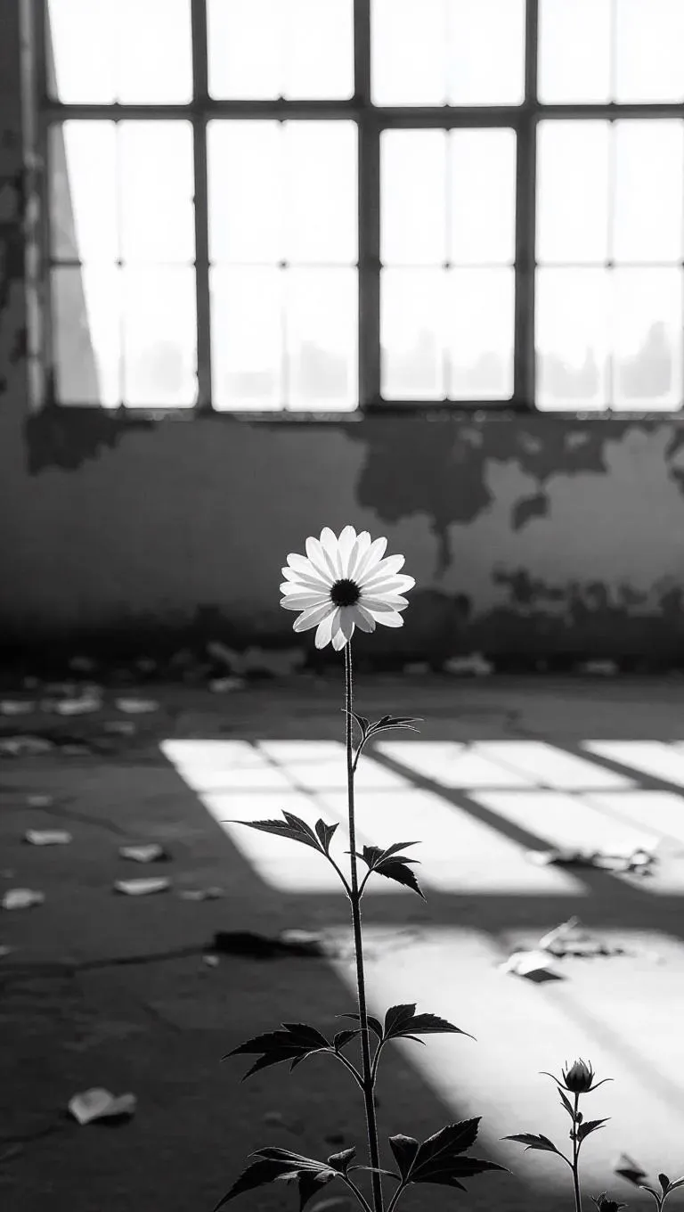 Generate stunning AI visuals of a vibrant yellow flower (single/double) blooming in a monochrome abandoned building, illuminated by a solitary sunbeam. Transform text prompts into surreal imagery with vivago.ai's advanced AI tools for photorealistic or artistic contrasts between life and decay. Explore creative editing for professional-grade AI effects.