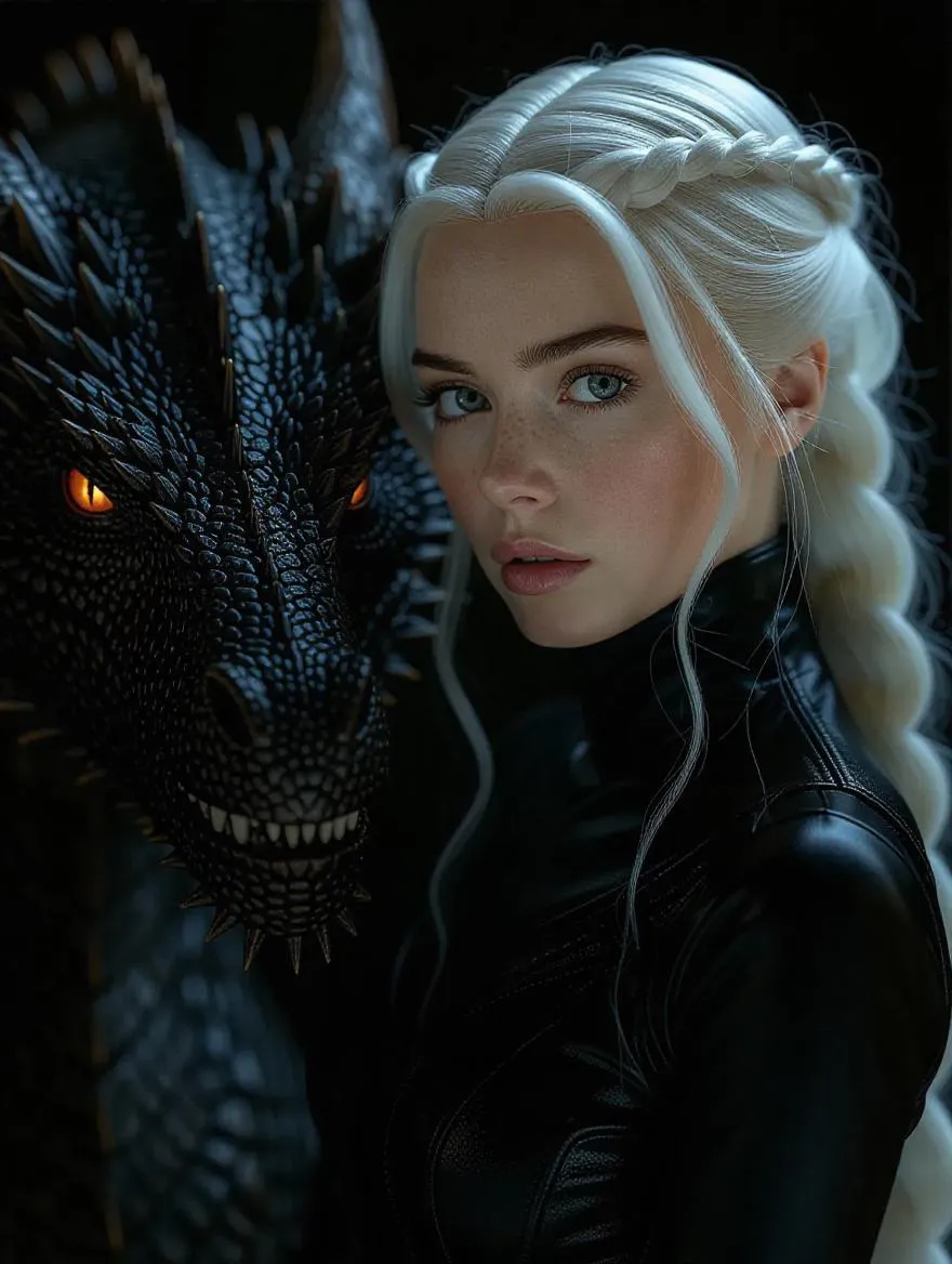 Create mesmerizing AI art with a close-up of a majestic black dragon and a striking white-skinned woman, illuminated by phosphorescent black light against a dark backdrop. Vivago.ai’s AI image generator crafts vivid, high-contrast visuals with intricate details, perfect for stunning fantasy-themed content.