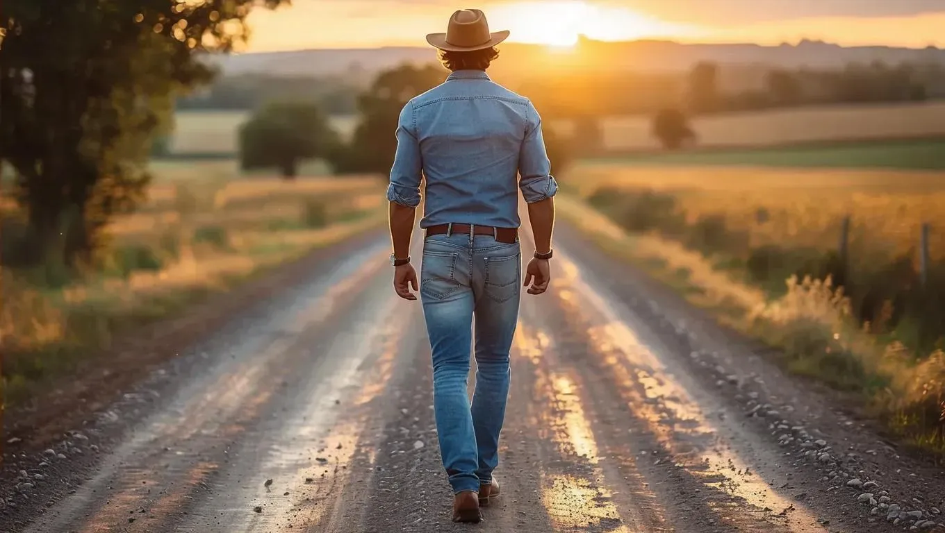 Create a striking image of a man in a blue dress shirt, jeans, cap, and watch walking on a rugged soil road, viewed from behind. Transform your vision into professional AI-generated visuals with vivago.ai's text-to-image tools, realistic effects, and precision editing for lifelike outdoor scenes.