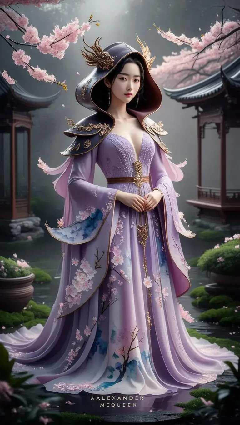 Create hyper-realistic AI character illustrations with intricate lavender gowns, aqua cherry blossom patterns, and layered veil headpieces. Inspired by Alexander McQueen and Pre-Raphaelite art, generate 4K visuals featuring misty Japanese gardens, dramatic lighting, realistic textures, and delicate lace embroidery. Perfect for fantasy storytelling, cosplay designs, or high-end fashion concept art with AI-powered precision.