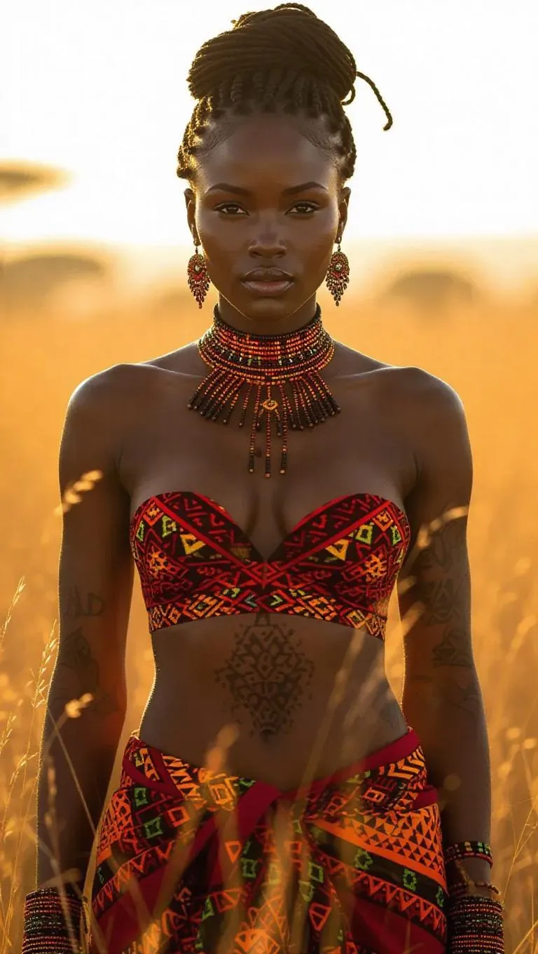Generate a striking African woman with traditional loincloth and intricate chest tattoo using vivago.ai's AI image generator. Create confident portraits against vibrant savanna backdrops, enhanced with tribal art effects for professional-grade visual storytelling.