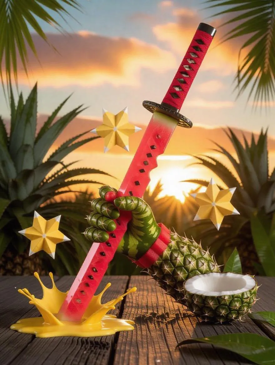 Generate hyper-realistic AI art of absurd tropical fruit weaponry: watermelon katanas, pineapple grenades, and durian morning stars clash on a vibrant battlefield. Craft surreal fruit-based combat visuals with sticky pulp splatters, citrus shrapnel bursts, and dewy rind textures using AI-powered tools for imaginative, hyper-detailed tropical warfare concepts.