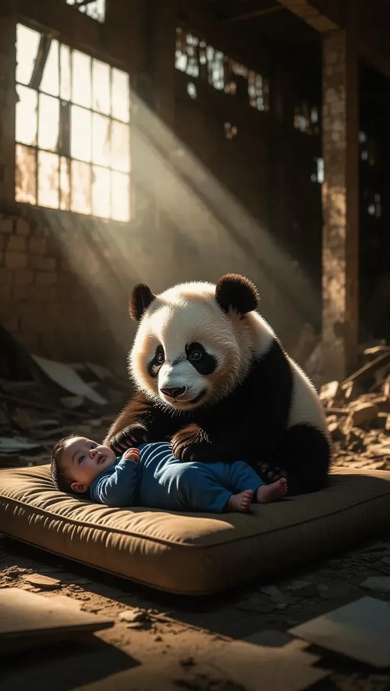 Photorealistic cinematic scene in a war-torn warehouse turned shelter. Debris-littered floor, dim light through broken windows. Fluffy black & white panda cub gently places sleeping Indian baby in blue swaddle on mattress amidst rubble. Ultra HD 8K imagery captures intimate, protective bond amid chaos. Photorealistic, cinematic, ultra-detailed.