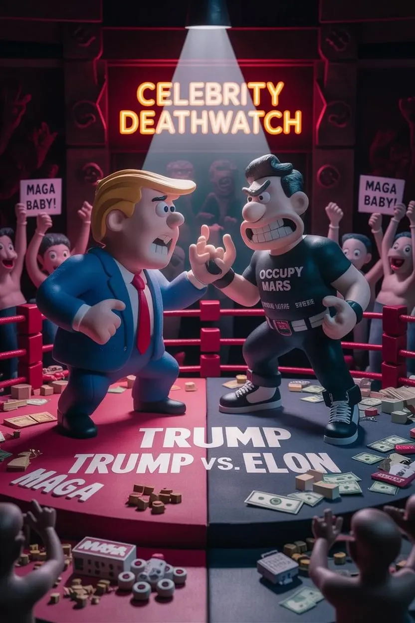 Experience AI-generated claymation magic with vivago.ai! Witness a dynamic "Celebrity Deathmatch" showdown: Trump vs. Elon Musk as exaggerated clay fighters in a detailed arena. MAGA-themed debris clashes with rockets, Teslas, and cash. Neon signs, cheering fans, stop-motion textures, and handcrafted shadows bring this AI-crafted scene to life. Create your own dramatic AI art with professional clay-style effects.