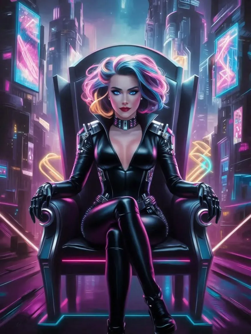 Generate a cyberpunk fantasy queen ruling a neon-lit metropolis with AI-powered precision. Vivago.ai transforms text into vivid AI art: glowing scepter, holographic skyscrapers, shifting chromatic hair, and cybernetic enhancements. Ideal for futuristic character design, sci-fi visuals, and tech-dystopian themes. High-res, detailed imagery for digital creators seeking cutting-edge AI-generated cybernetic royalty.