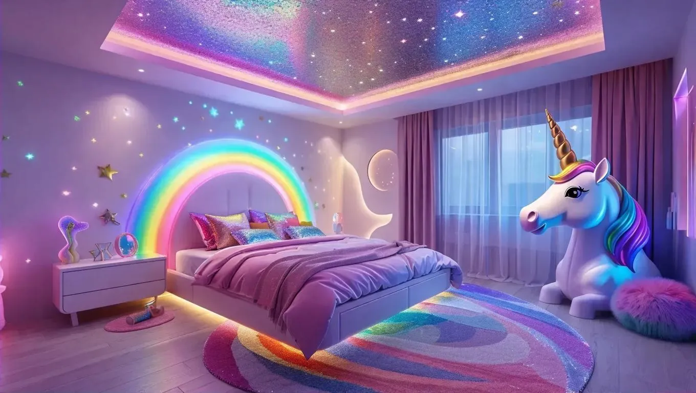 Create a magical AI-generated unicorn-themed room with vivago.ai. Design a futuristic dwelling featuring an extravagant unicorn bed, glowing neon accents, holographic decor, and a glittering stardust ceiling. Enhance your scene with rainbow nightstands, plush rugs, and iridescent details using professional AI tools for whimsical, attention-grabbing visuals.