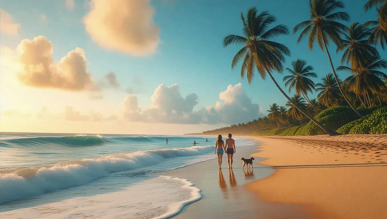 Create a stunning AI-generated beach scene with palm trees, a couple walking their dog by turquoise waters, surfers riding big waves, and vivid sunset skies. Transform your vision into a tropical paradise using vivago.ai's AI image tools and professional editing effects.