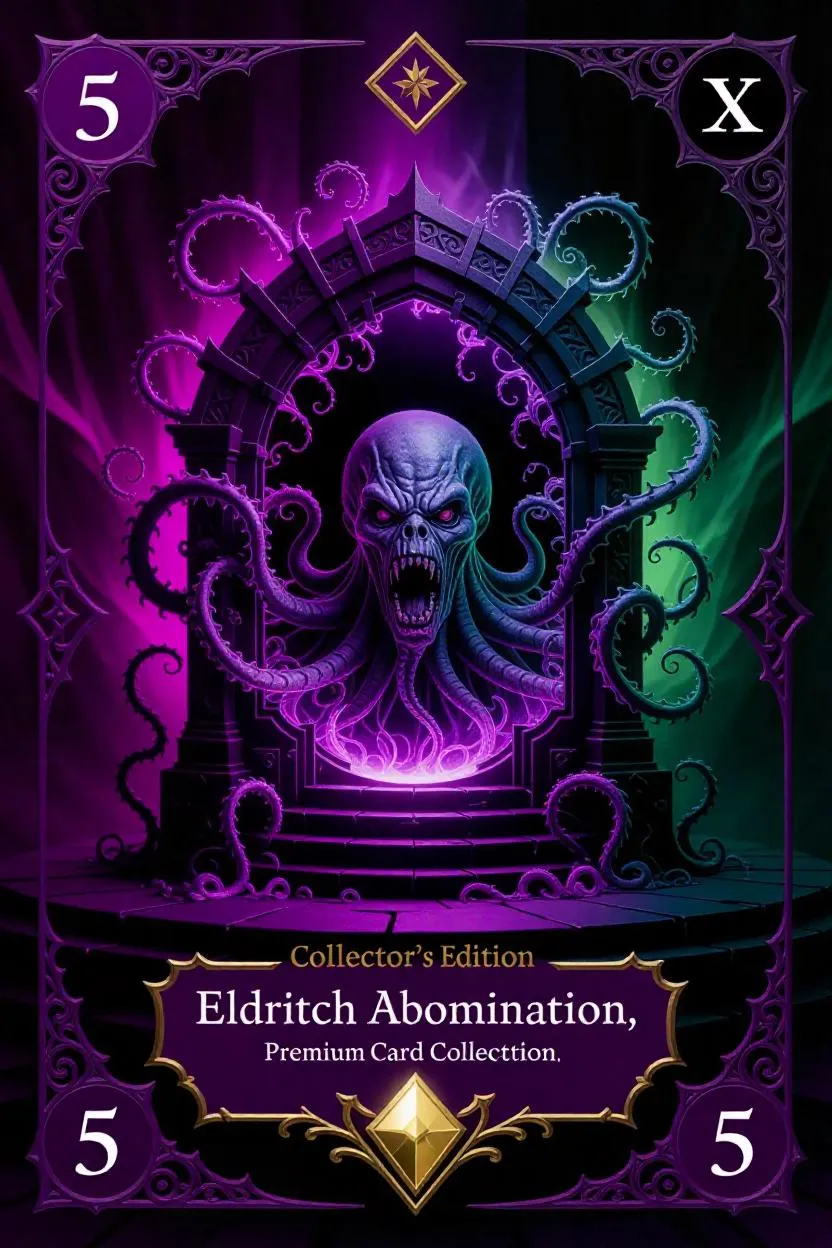Unveil the legendary 'Eldritch Abomination' from the dark fantasy 'Premium Card Collection'—a grotesque tentacled creature emerging from a mystical portal, bathed in swirling purple-black gradients and eerie green glows. Arcane symbols, Gothic filigree borders, and a gold rarity icon highlight this 5-mana legendary card, embodying eldritch horror and premium collectible artistry in a haunting, otherworldly design.