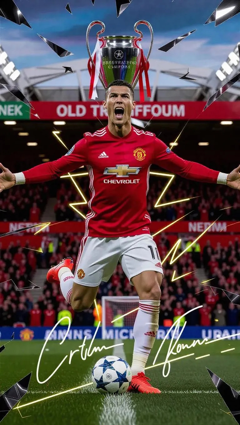 AI-generated Cristiano Ronaldo artwork captures CR7's iconic Manchester United celebration with dynamic motion trails, geometric stadium shards, and neon-accented CR7 typography. Features Champions League action, Adidas/Nike gear, and Unreal Engine 5 rendering. Experience next-gen 8K AI visuals blending football passion with cutting-edge digital artistry.