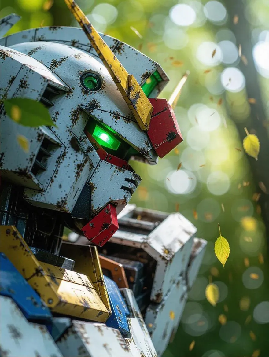 Generate an AI-powered jungle ambush scene featuring a dynamic Gundam impact with flying leaves. Add immersive ASMR sound effects: slow-motion rustling, bass booms, and soft reverb thuds. Create professional videos and visuals using vivago.ai's image generator and editing tools.