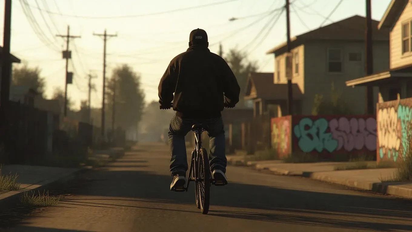 Generate dynamic GTA-style urban scenes with AI: Young Black gangster cycling through a gritty cul-de-sac, flanked by single-family homes. Crafted for edgy street narratives, blending retro gaming vibes, vivid details, and hyper-realistic AI-generated visuals. Ideal for immersive storytelling, game art, or urban-themed projects. Elevate creativity with vivago.ai's cutting-edge tools.