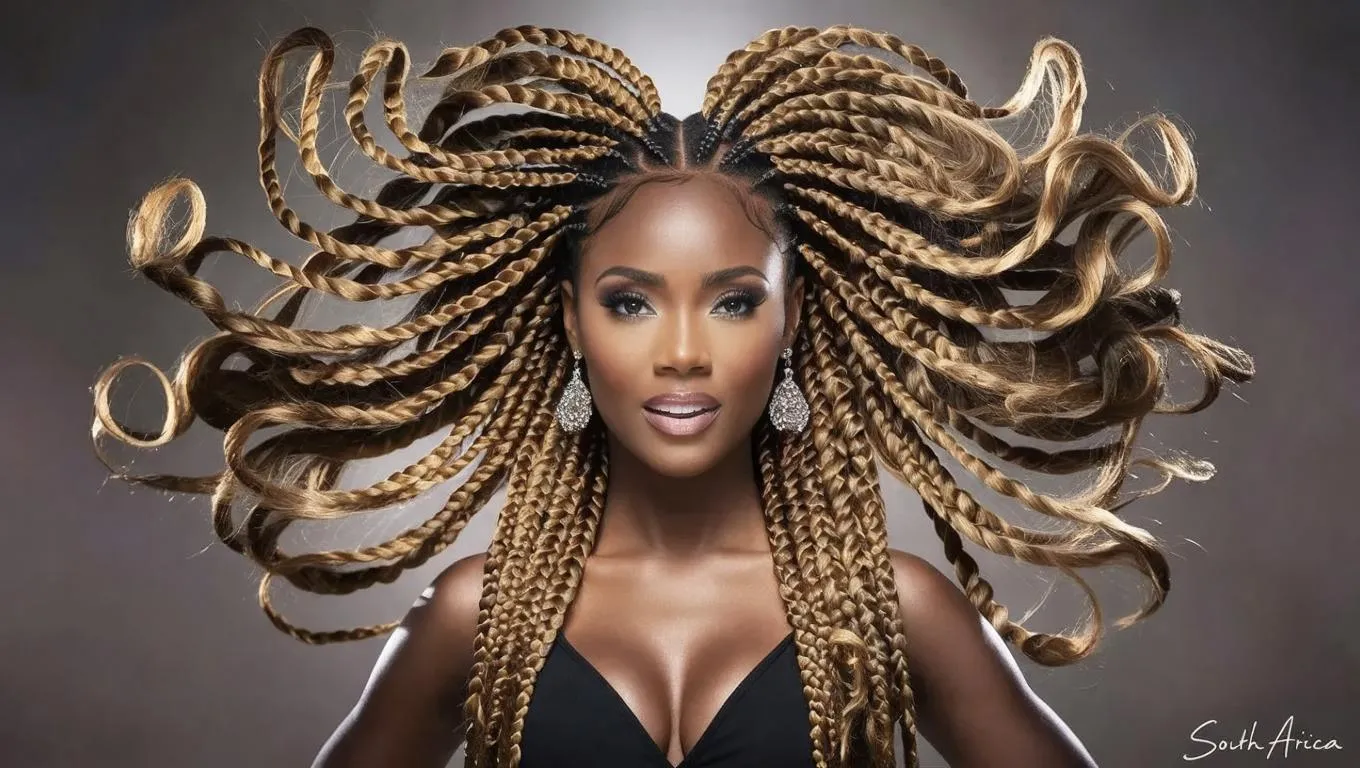 Create vibrant AI images of a South African woman with long braids, windswept curls enhanced by AI effects. Highlight dynamic hair movement, intricate curl details, and lifelike wind textures using Vivago.ai's tools for striking, professional-grade visuals.