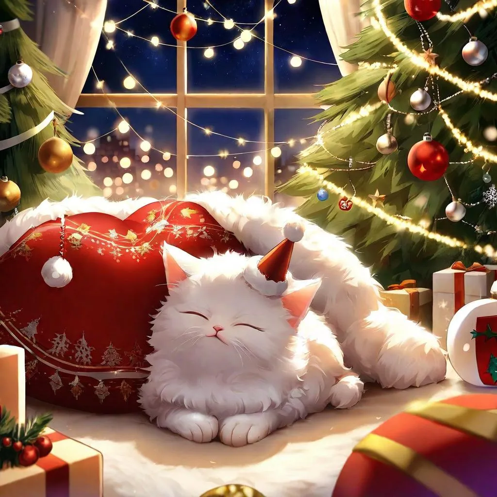 Create a heartwarming AI-generated painting of a cute kitten sleeping peacefully by a glowing Christmas tree. Vivago.ai transforms text prompts into festive holiday art, blending adorable feline charm with cozy Christmas magic through advanced AI image generation tools for enchanting visual storytelling.