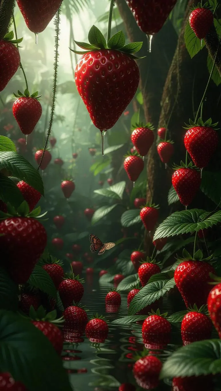 A deep, humid jungle where towering trees bear giant strawberries the size of hot air balloons. Their red skin pulses gently, and the leaves rustle like silk. Exotic animals sip from bubbling pools of rich jam. Vines twist like arteries, and fruit-shaped insects with honey-sugar wings pollinate vibrant flowers.