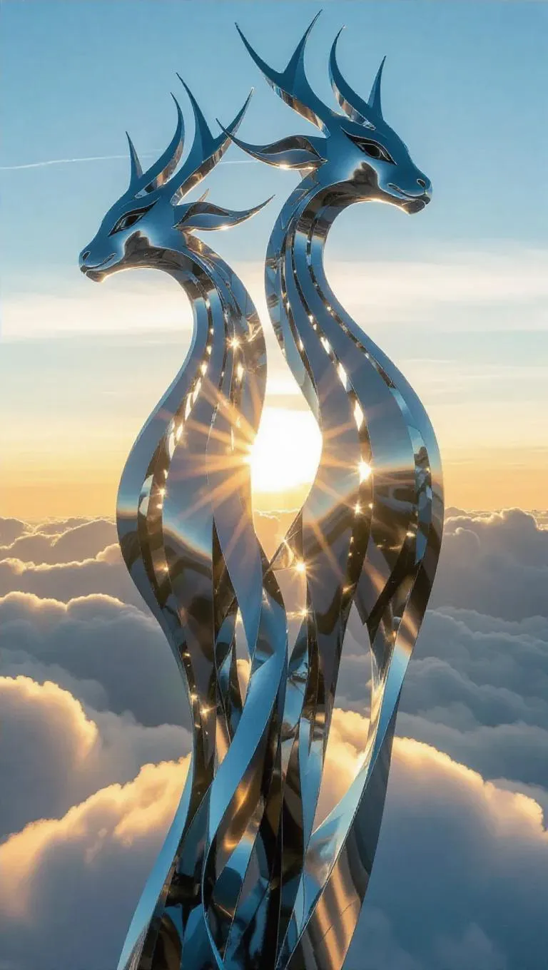 The sculptures are crafted from a luminous material that can fly softly on the clouds. They showcase forms like mythical beasts, cosmic objects, or intricate artistry. These sculptures look graceful as they sway with the wind, fostering an exhilarating and magical feel. The late afternoon sun filters through them, creating a format of shadows on the clouds below.