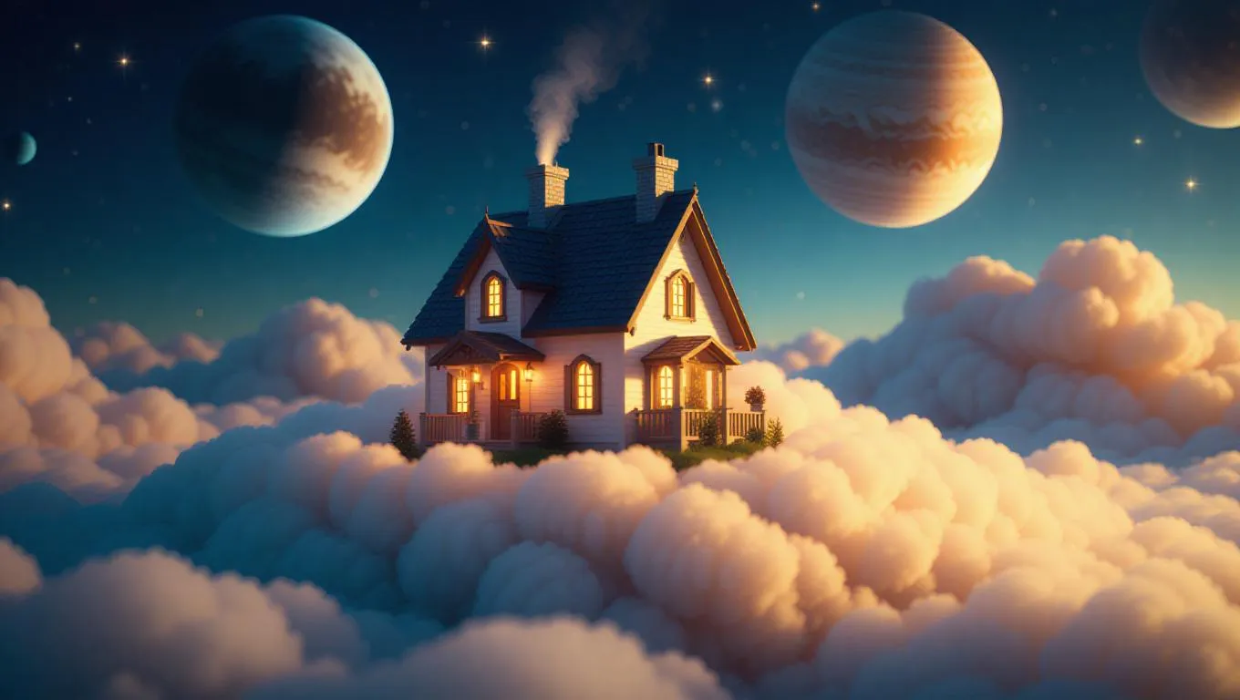 A delightful cottage perched atop a fluffy cloud, warm golden light pouring from its windows, encased in sparkling dew. Above, luminous planets shine brightly in the night sky, creating a magical and serene atmosphere.
