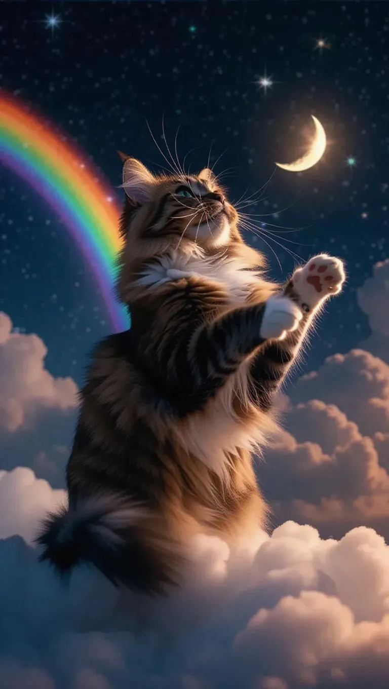 A fluffy cat perched on a fluffy cotton-soft cloud, playfully swiping at radiant rainbow arcs, surrounded by a tranquil night sky with shimmering stars and a glowing crescent moon, creating a whimsical and magical atmosphere.