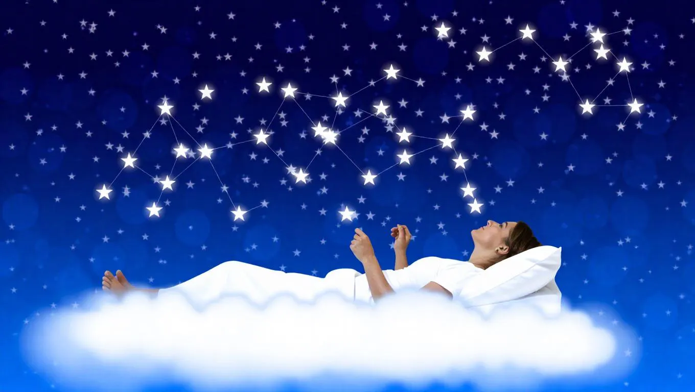 A bed made of clouds, with a person daydreaming, floating among constellations