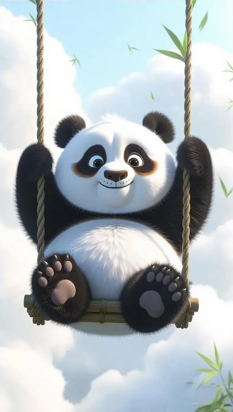 Fluffy, black-and-white cloud pandas swing joyfully between ethereal cloud pillars. Button noses twitch playfully, sleepy eyes crinkle with delight as they grip glowing bamboo-shaped ropes. Puffy paws dangle freely, clouds billow softly beneath them. Tiny cloud fairies hitch rides, giggling as they soar through the sky, carried by the gentle breeze and the rhythmic sway of the panda swings.