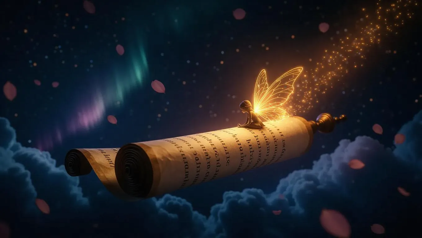 A tiny, glowing fairy rests on a legendary, ancient scroll that hovers in mid-air, its script aglow with golden letters. Surrounding them, dreamy cotton-like clouds drift infinitely, interspersed with glowing stars and softly drifting petals, while a magical aurora weaves through the distant, shimmering night sky.