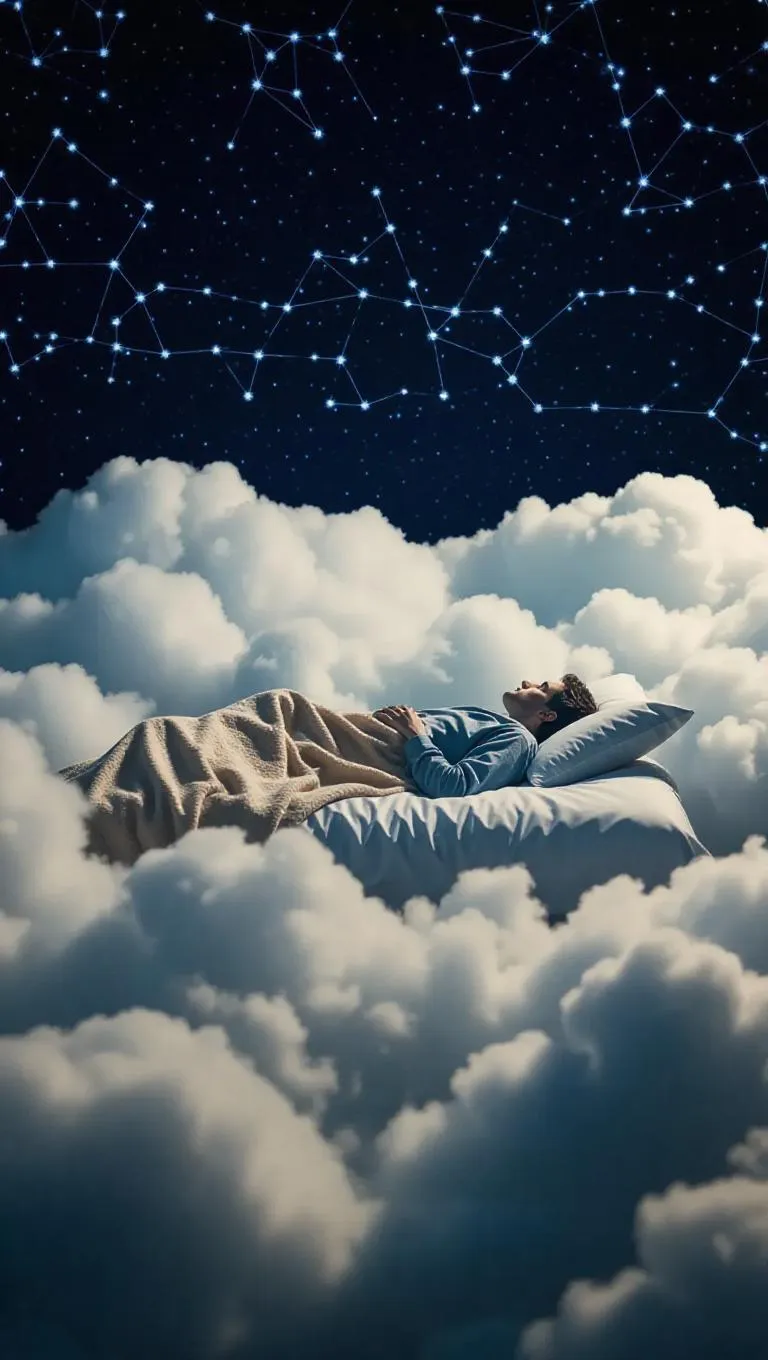 A bed made of clouds, with a person covered in a blanket, floating among constellations