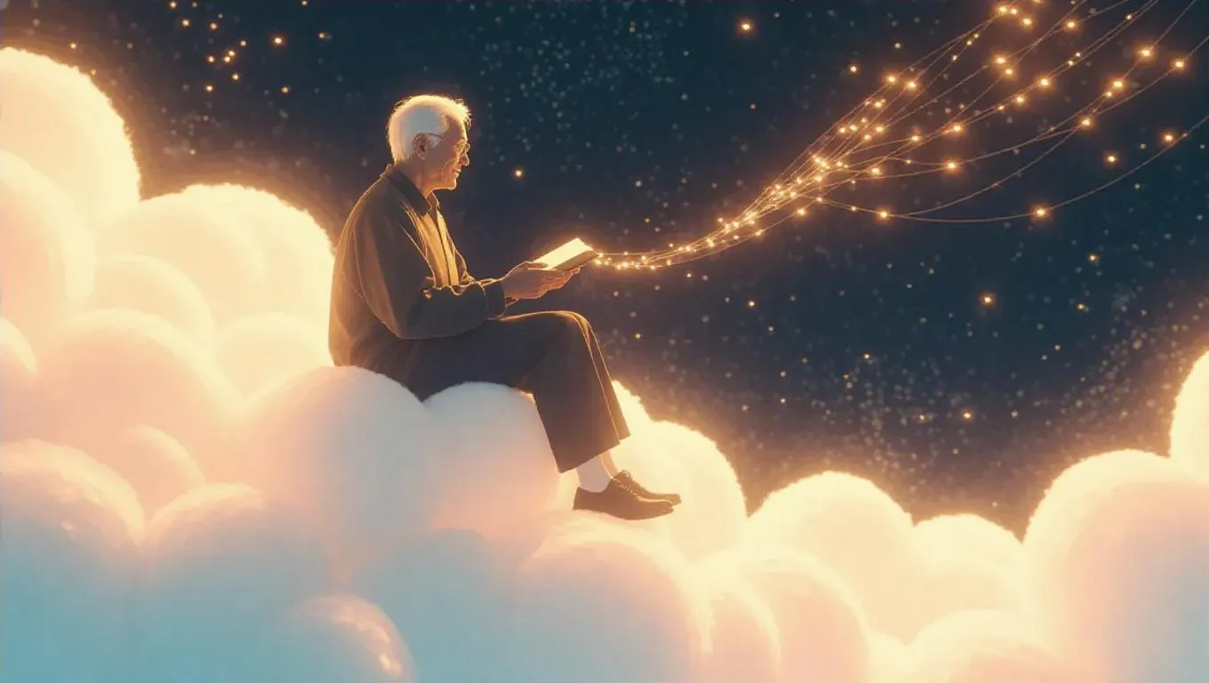 An elderly storyteller perches on a cotton candy cloud, weaving tales with shimmering threads of starlight that twist into gentle, wispy shapes above their hands. Below, the world drifts under a silken blanket of fog, while fireflies gleam like scattered dreams, ready to come alive.