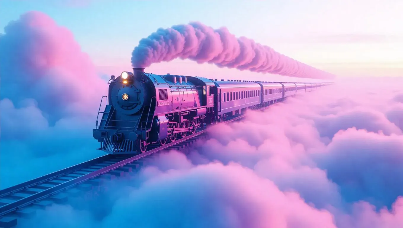 A spectral train made of swirling mist, gliding effortlessly along ethereal tracks laid across pastel-colored clouds, bathed in a soft, radiant glow, with flickers of fire trailing behind, creating a dreamlike and enchanting atmosphere.