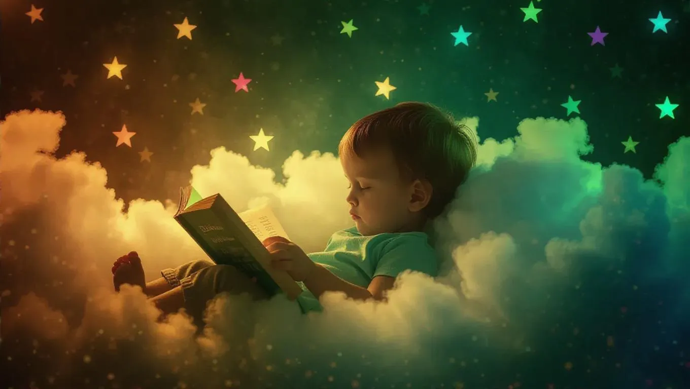 A child cuddled up on a fluffy cloud, lost in a glowing book, glimmering under soft, green lighting, surrounded by colorful stars and gentle mist, creating a magical and serene atmosphere