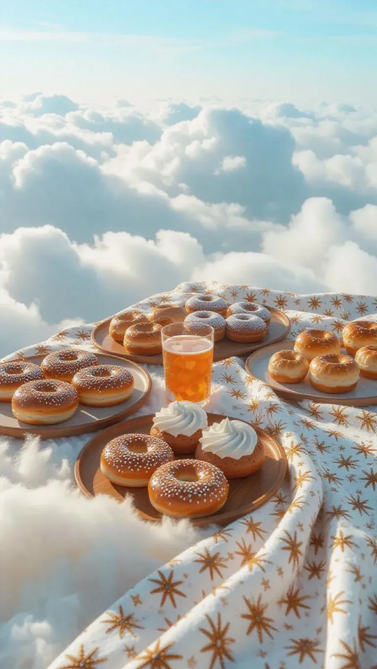 Above the clouds, a charming brunch unfolds on a vast, cushioned expanse of soft, fluffy clouds. An embroidered blanket, shimmering with tiny star-like sparkles, is spread out, adorned with an array of tasty treats. Earthen plates hold bagels made with dough as soft as clouds, filled with slices of creamy fruits that seem to capture the essence of the sun, surrounded by dainty pastries and sparkling beverages.
