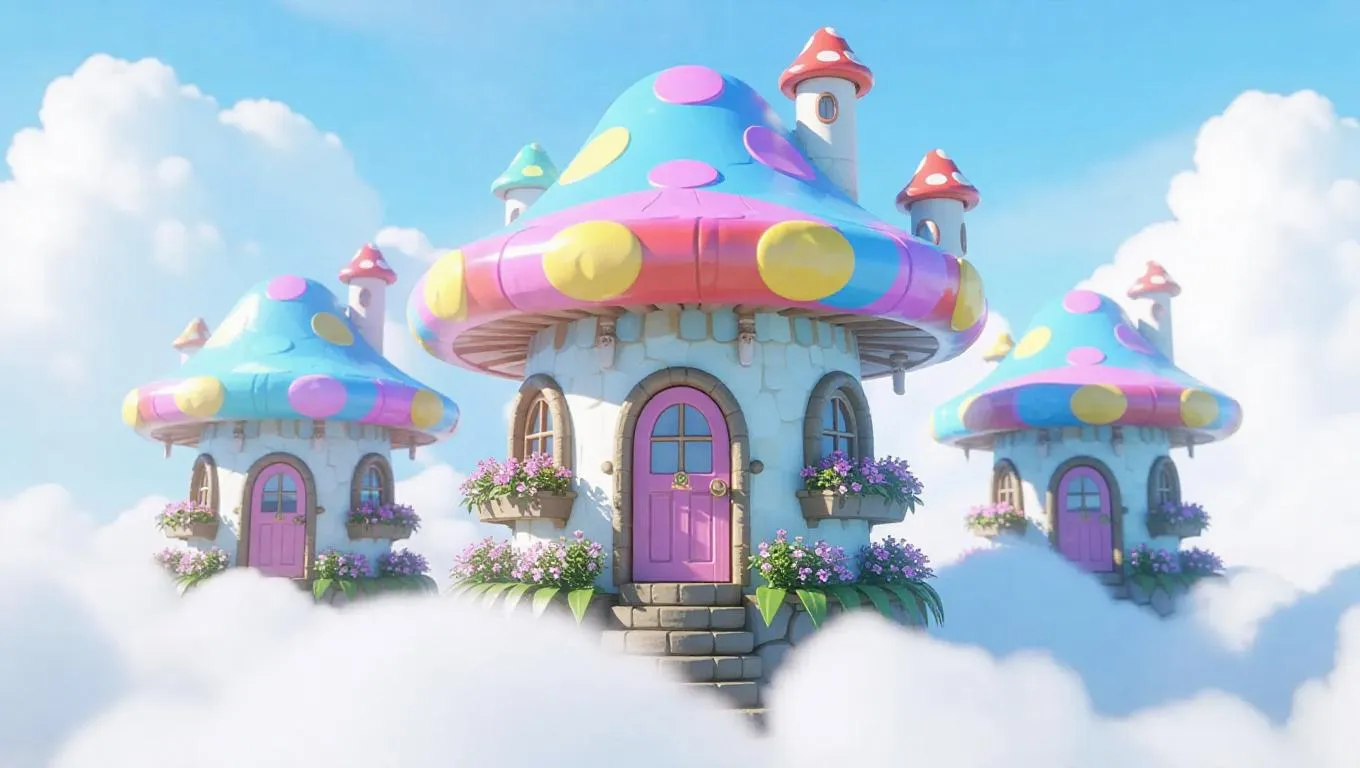 Miniature, mushroom-shaped edifices crafted from a blend of cloud and fantasy, floating blissfully above the fluffy clouds. Colorful caps with swirls and stripes, durable curvy stems. Tiny doors and windows with fluttering fabrics, flower boxes brimming with exotic blooms, enhancing the magical setting.