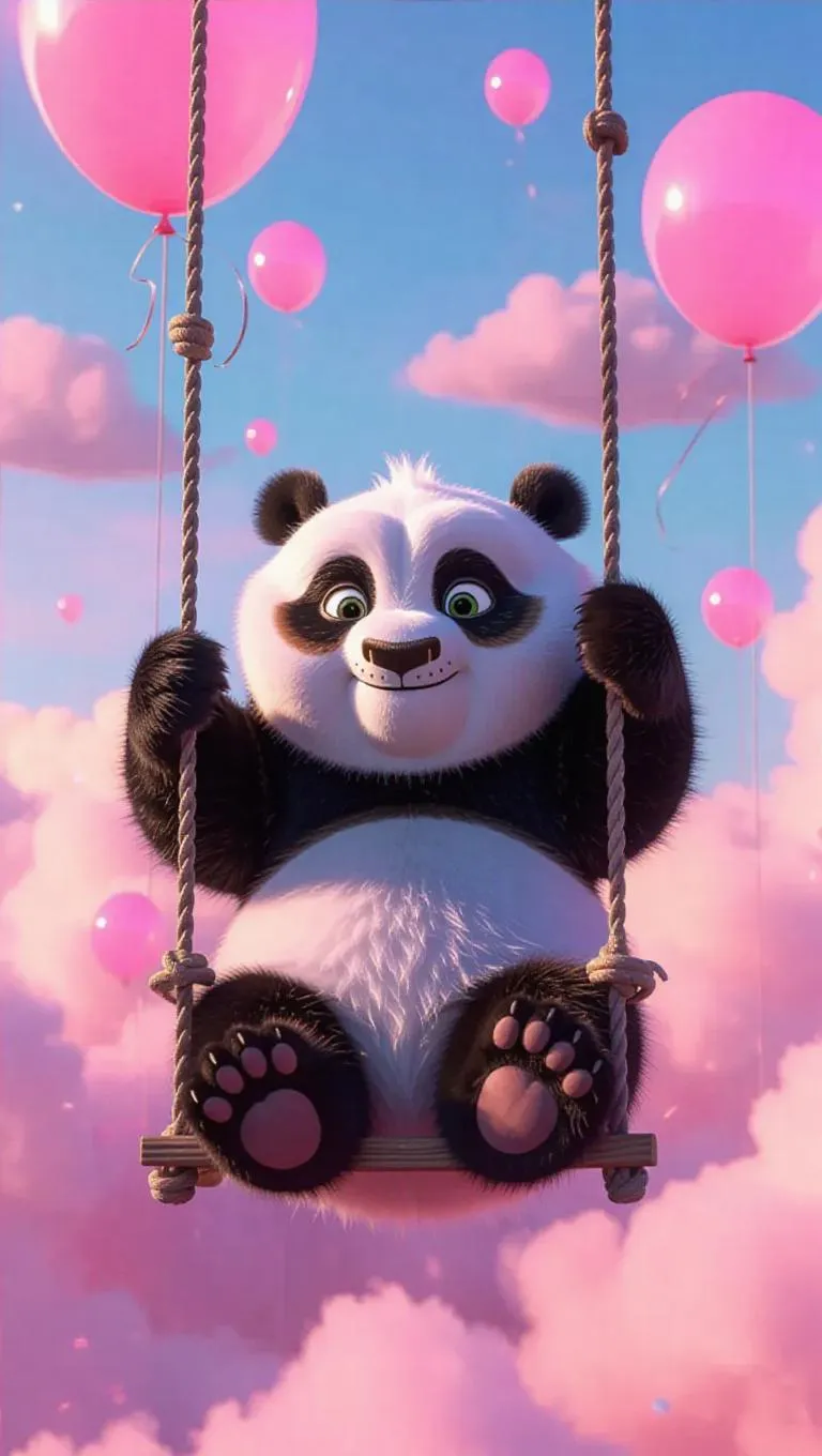 Fluffy, pink-and-white cloud pandas swing joyfully between fluffy cloud pillars. Button noses wiggle playfully, sleepy eyes shimmer with delight as they grip glowing balloon-shaped ropes. Puffy paws dangle freely, clouds billow softly beneath them. Tiny cloud fairies hitch rides, giggling as they soar through the sky, carried by the gentle breeze and the rhythmic sway of the panda swings.