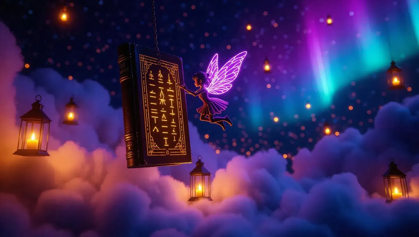 A miniature, sparkling pixie alights on an ancient, magical manuscript suspended in mid-air, its characters glowing with warm golden hieroglyphs. Surrounding them, ethereal cotton-like clouds stretch endlessly, adorned with sparkling lanterns and whimsical floating ribbons, while a vivid aurora swirls in the far-off, sparkling night sky.
