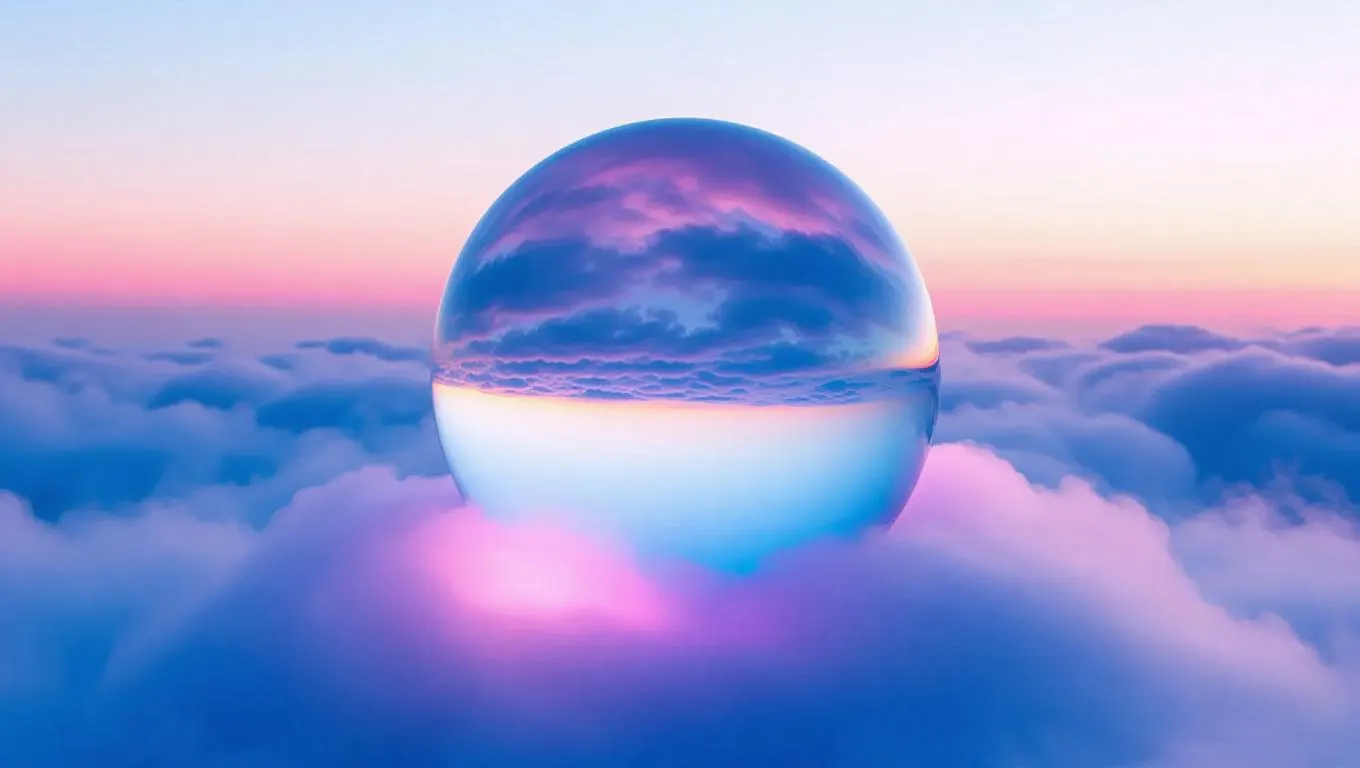 A luminous crystal orb set on a gentle cloud, displaying the vivid colors of the twilight sky, with wispy mists floating below, evoking an enchanting and serene environment.