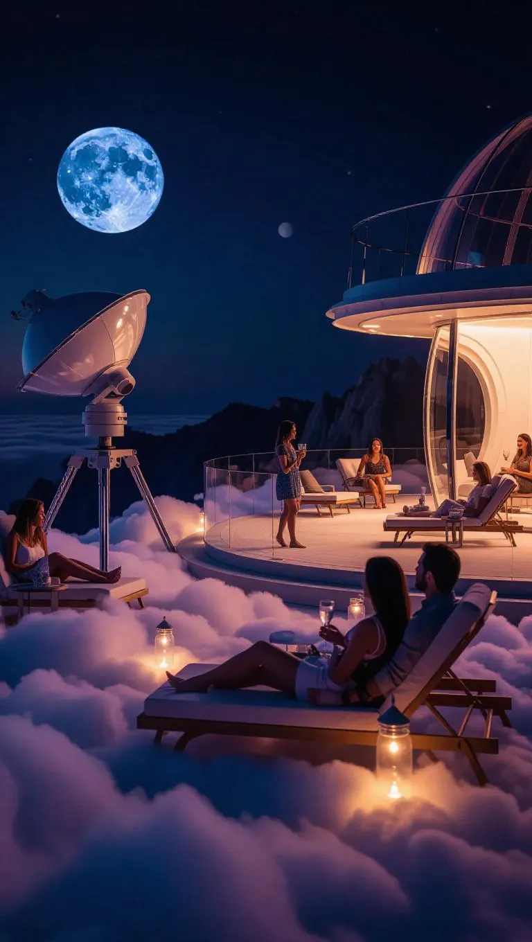 Guests gather on vast, fluffy cloud decks boasting modern telescopes and comfortable lounge chairs. Expert astronomers share enchanting stories and facts about the celestial realm, while others savor sweet bites of cloud candy and heavenly drink under the soft light of a full moon.