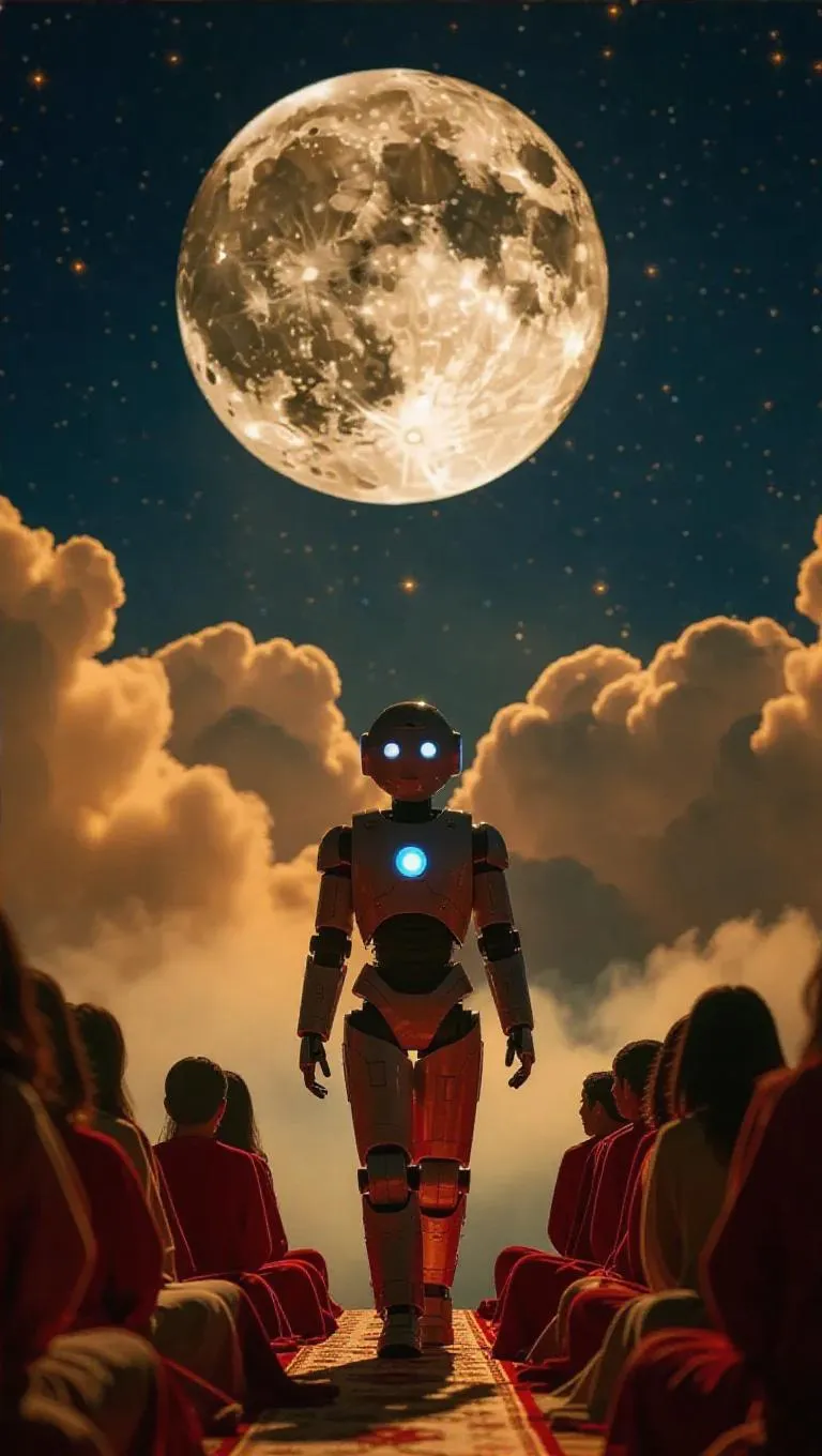 Aunt Moon stitches a sparkling blanket runway across the evening clouds with magical sparkling dust, young models walk in creative artist pajamas. Robot pajamas beep quietly with each step, glowing nightcaps play inspiring ballads. The audience is dreamy onlookers nestled in plush velvet blankets.