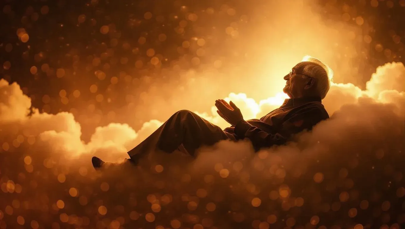 An elderly storyteller lounges on a wispy cloud, weaving tales with shimmering threads of starlight that twist into brilliant, fantastical shapes above their hands. Below, the world drifts under a soft blanket of haze, while fireflies blink like distant wishes, ready to come alive.