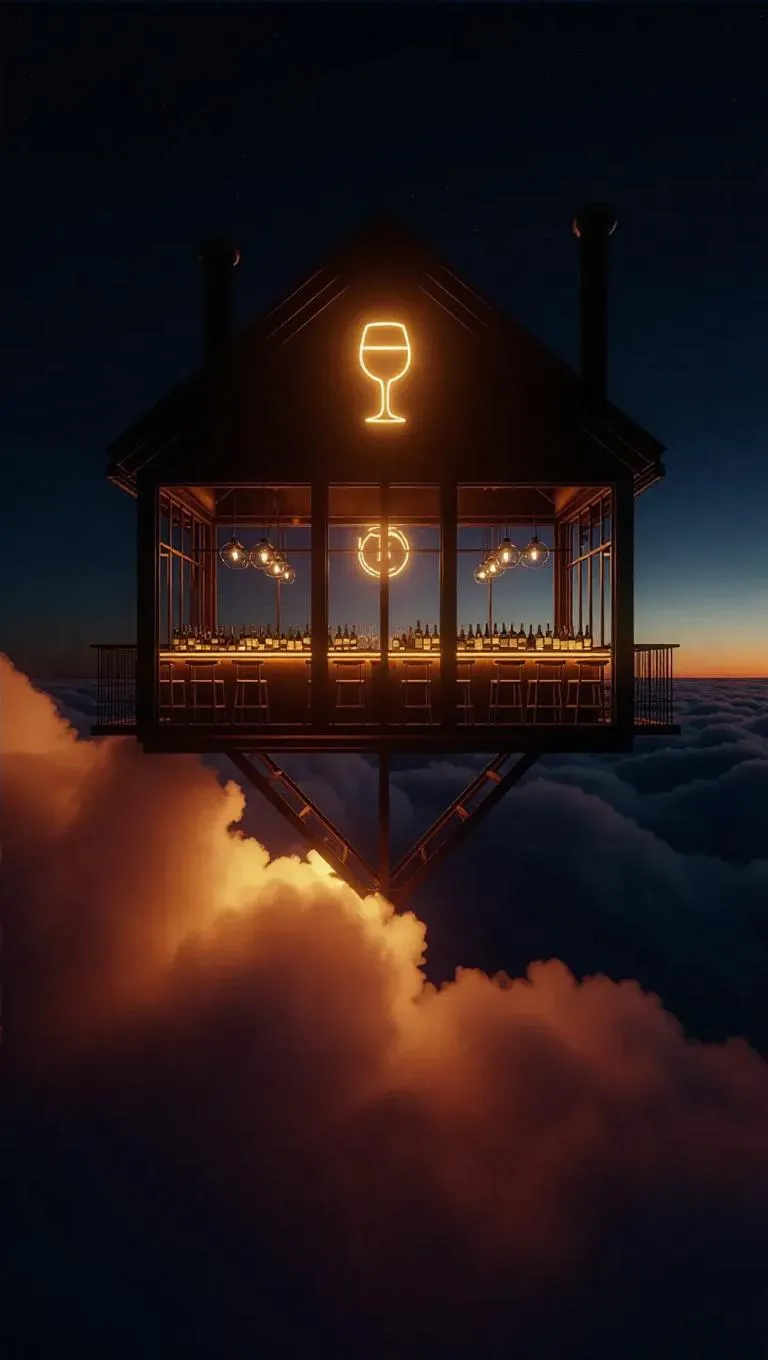 Above the clouds, an elegant wine bar perches on a fluffy cloud platform. Its refined walls shimmer with twinkling starlight, and a glowing wine glass sign beckons visitors. Large windows frame breathtaking views of the sky, allowing soft, warm light to flood the cozy interior.